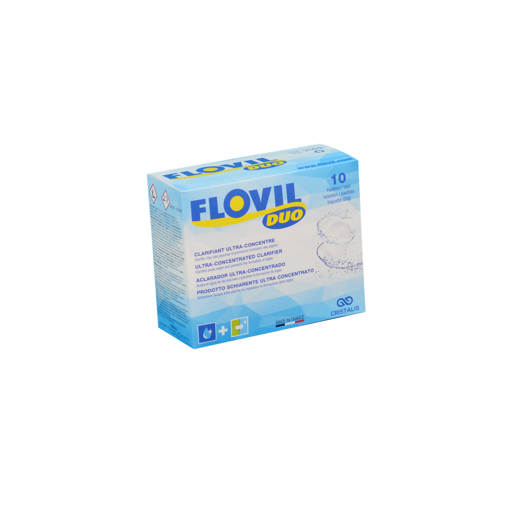 FLOVIL DUO ist ein Flockungsmittel in Tablettenform, das Schwimmbadwasser klärt, die Filterfeinheit von Sand, Taschen - und Kartuschenfiltern optimiert und der Algenbildung vorbeugt